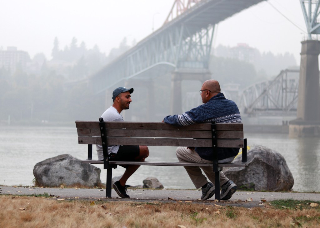 Bhavesh Chauhan (left) with Kayden Bhangu on Granville Street Bridge in Vancouver